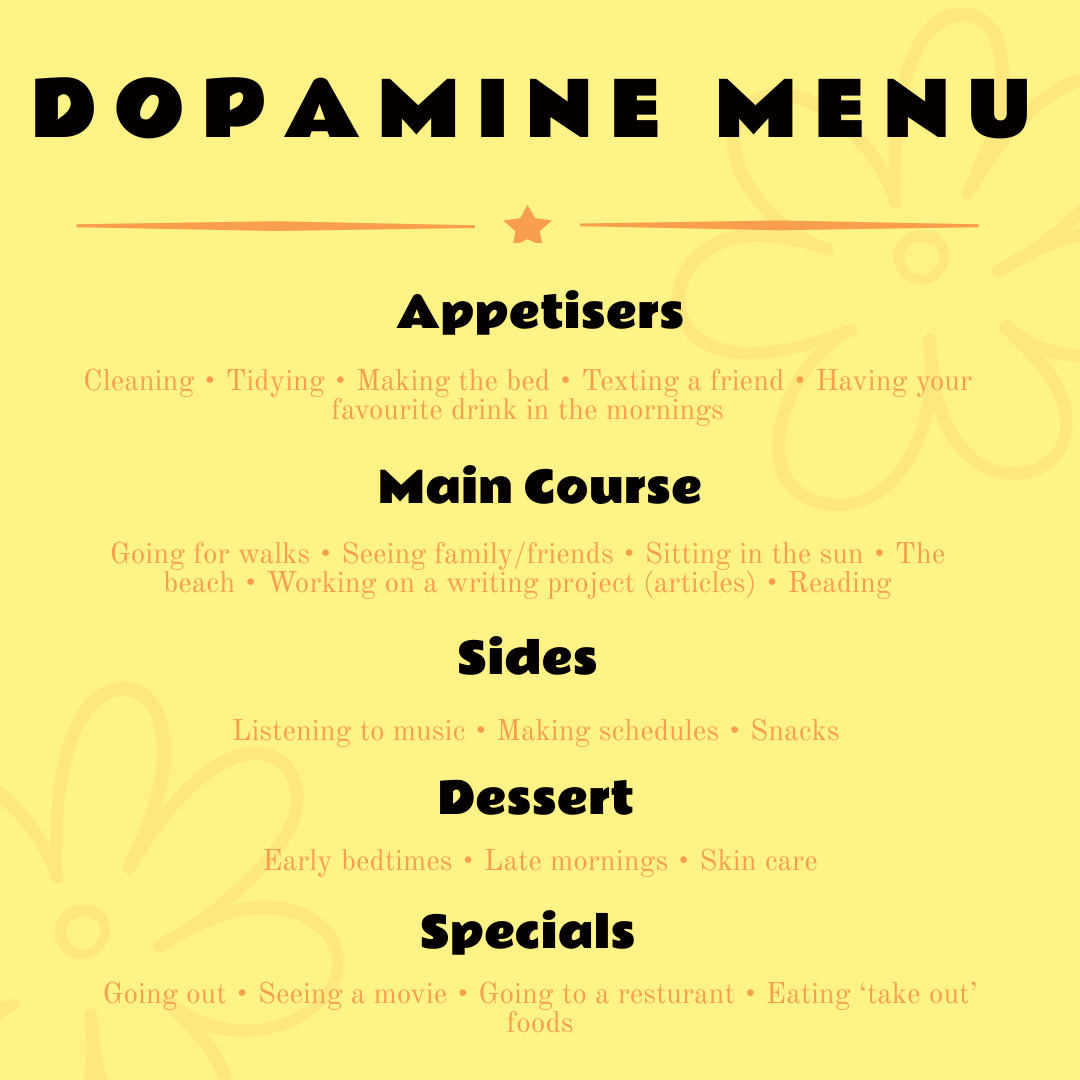So, in the spirit of mental health day (which I am a bit late for), I welcome you to my 101 guide in making your own dopamine menu, and how I’ve constructed mine. This is divided into several parts, like an actual menu: