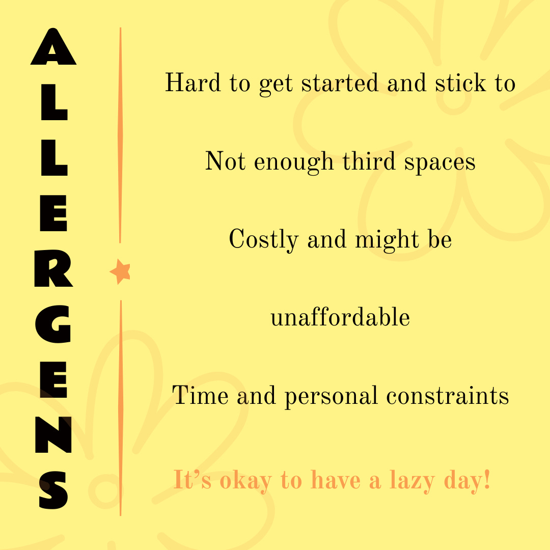 This is where the majority of your hobbies lie. If you don’t really know what your entrees would look like, it would be a good time to explore some hobbies. Try the usuals: writing, reading, drawing, exercising—or maybe more specific things; making zines pottery, clay making, soccer. See what you like doing! I’ve recently started an exercise routine which I’m enjoying.